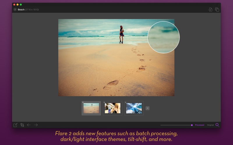 Flare 2 features,Simple Edit - Adjust effects quickly and easily,Advance Edit - Fine tune effects via a live preview,Snapshot - Temporarily saves your edits for later use,High Quality Textures, Borders and Frames,Batch Processing - Apply effects to a group of images effortlessly,Light & Dark interface themes,Unlimited Undos,Easy to use with iPhoto, Aperture, Photoshop and Lightroom,RAW format supported for importing photos,Crop and Rotate makes adjusting your source image a snap,Export photos in JPEG, PNG and TIFF formats,Share your creations on social networks or by e-mail,Online user guide